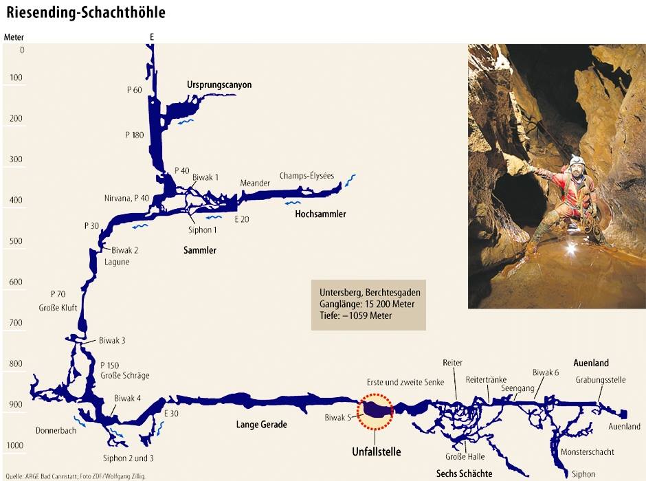 В горах ( Berchtesgaden Alps ) на границе Германии и Австрии ночью в воскресенье (ок 01.30) 08 июня произошел несчастный случай. В результате камнепада на глубине свыше 1000 метров серьезно пострадал спелеолог из Штуттгарта. Возможность самостоятельного подъема пострадавшим была утрачена. В составе группы было 3 спелеолога. Один (38 лет) остался с пострадавшим, другой (возраст не сообщается) за 12 часов вышел на поверхность и сообщил спасательным службам о происшествии.