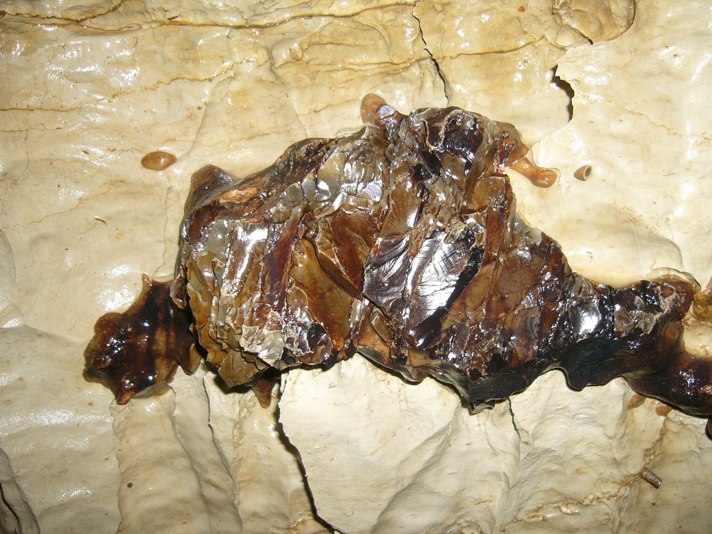 пещере на стенах видны какие-то темные конгломераты на фоне более светлого