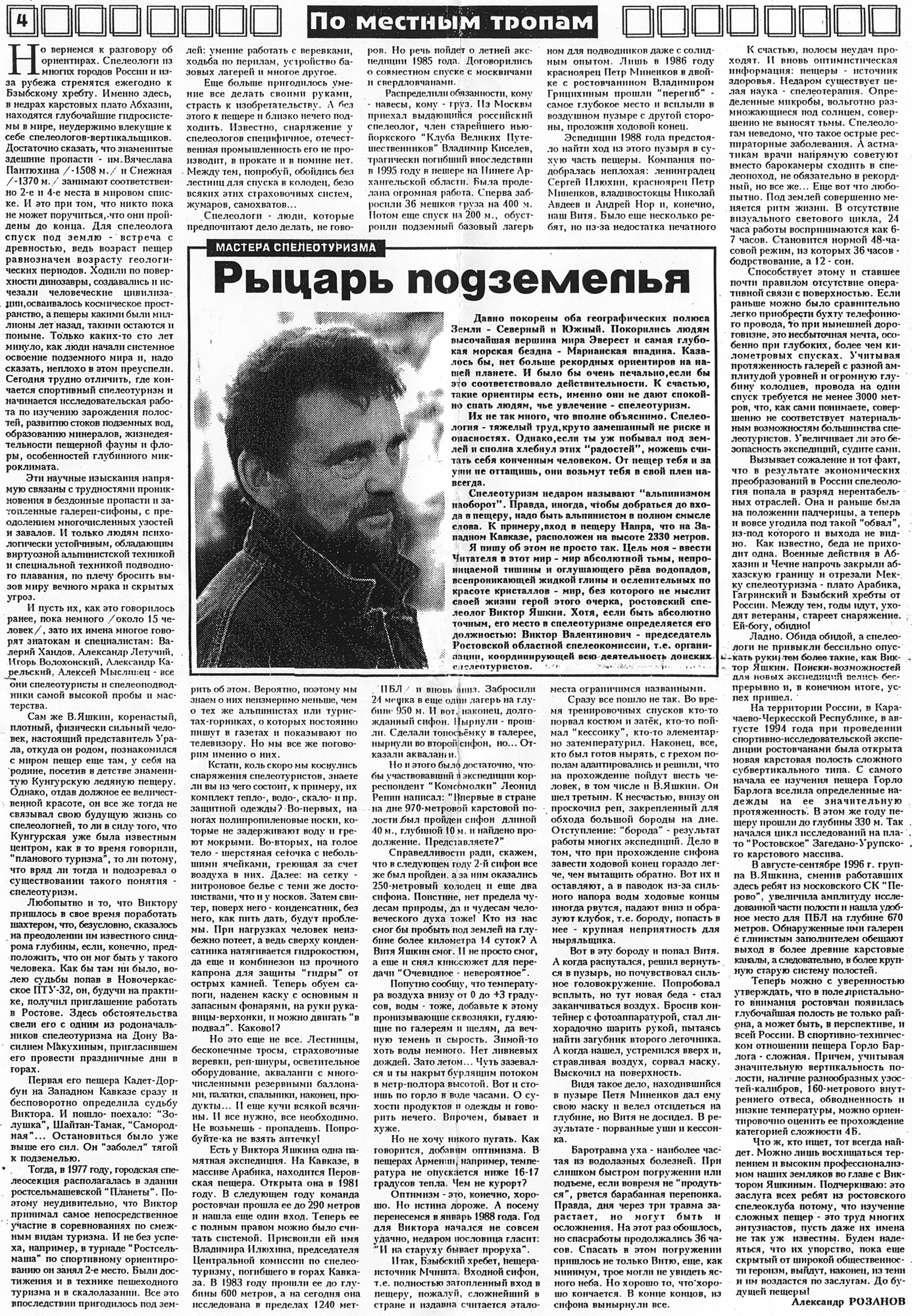 Здравствуйте уважаемые спелеологи.Сегодня - 15 февраля - исполняется 65 лет одному из самых заслуженных и авторитетных спелеологов не только Ростова-на-Дону, но, пожалуй, и всего отечественного спелеомира - Яшкину Виктору Валентиновичу.Для нас, младшего поколения спелеологов, Виктор Валентинович - или просто Мастер - по-прежнему остаётся жизненным ориентиром и мудрым наставником, к которому всегда можно обратиться за советом или помощью по любым (не только спелеологическим) вопросам.Вероятно, старшим поколениям спелеологов хорошо известны достижения Виктора Валентиновича в исследованиях пещер. Для тех, кто не застал эпоху Большой Советской Спелеологии, прикладываю скан старой и немного наивной статьи о Викторе Валентиновиче Яшкине.Хочется от лица Новочеркасской Спелеологической Секции поздравить Виктора Валентиновича, пожелать крепкого здоровья ему и его близким!Липченко Юрий.