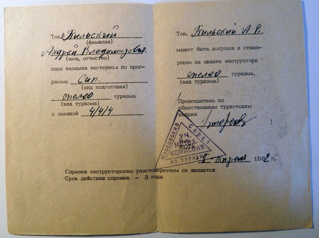 • Забавны твои рассуждения про то что для руководства 5-ой к.с. требовалось обучиться на ВТП. Это абсолютное враньё. Уж не надо мне, в прошлом члену МКК Москвы по спелеотуризму так откровенно врать.  А я лично собственно сначала прошел экстернат СИП и потом стажировался на звание инструктора на СТП (на Алеке). Справочку о руководстве 5Б прилагаю. Раритет. Прилагаю фотокопии подтверждающих мои слова документов. И жду от тебя хоть-что-то. О твоих выдающихся подвигах.