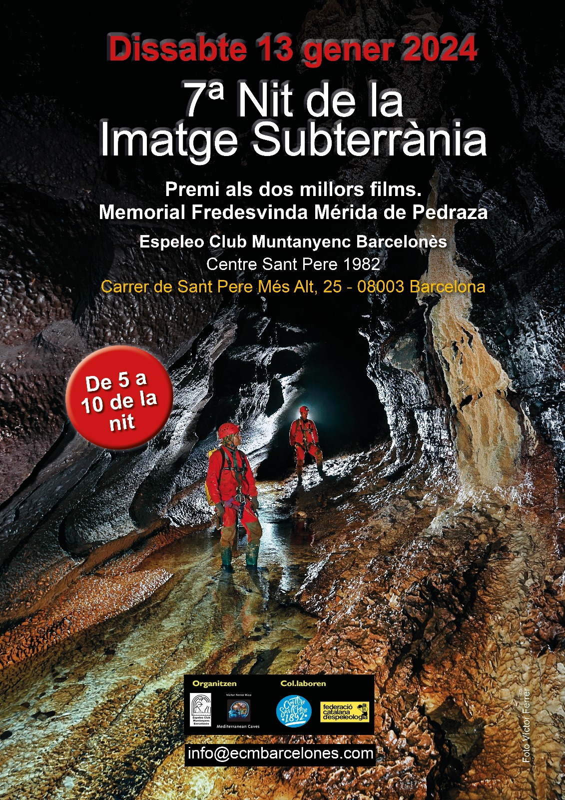 Good morning, from the Espeleoclub Muntanyenc Barcelonès (Barcelona, Spain) we are organising the 7th edition of "La Nit de la Imatge Subterrània", a competition-projection of films about caving and canyoning. This year there are two €500 prizes for the winning documentaries. We kindly ask you to spread the call for entries to all clubs and federations.