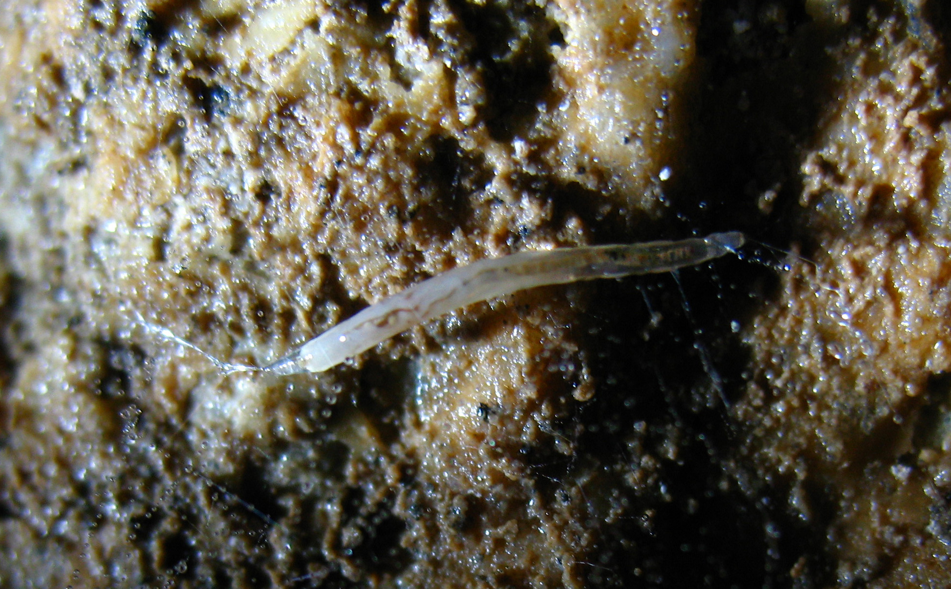 Личинка выглядит как полупрозрачный тонкий червячок, несколько миллиметров в длину, иногда просвечивает темным кишечник, если заполнен пищей. Из всего тела окрашена только головная капсула - темная точка на переднем конце тела (у видов средней полосы; что там в Гватемале, не знаю). На фото – та же Speolepta с Урала. Личинка ползает по нитям, получалось иногда ее приманить, поместив на нить пойманного комара (прилипает; лучше, чтоб комар был не очень активный, но шевелился). Если решите собрать материал, фиксировать можно в 70% спирте. Личинки определяются плохо, взрослые комары – лучший вариант (обычно их можно найти рядом).
