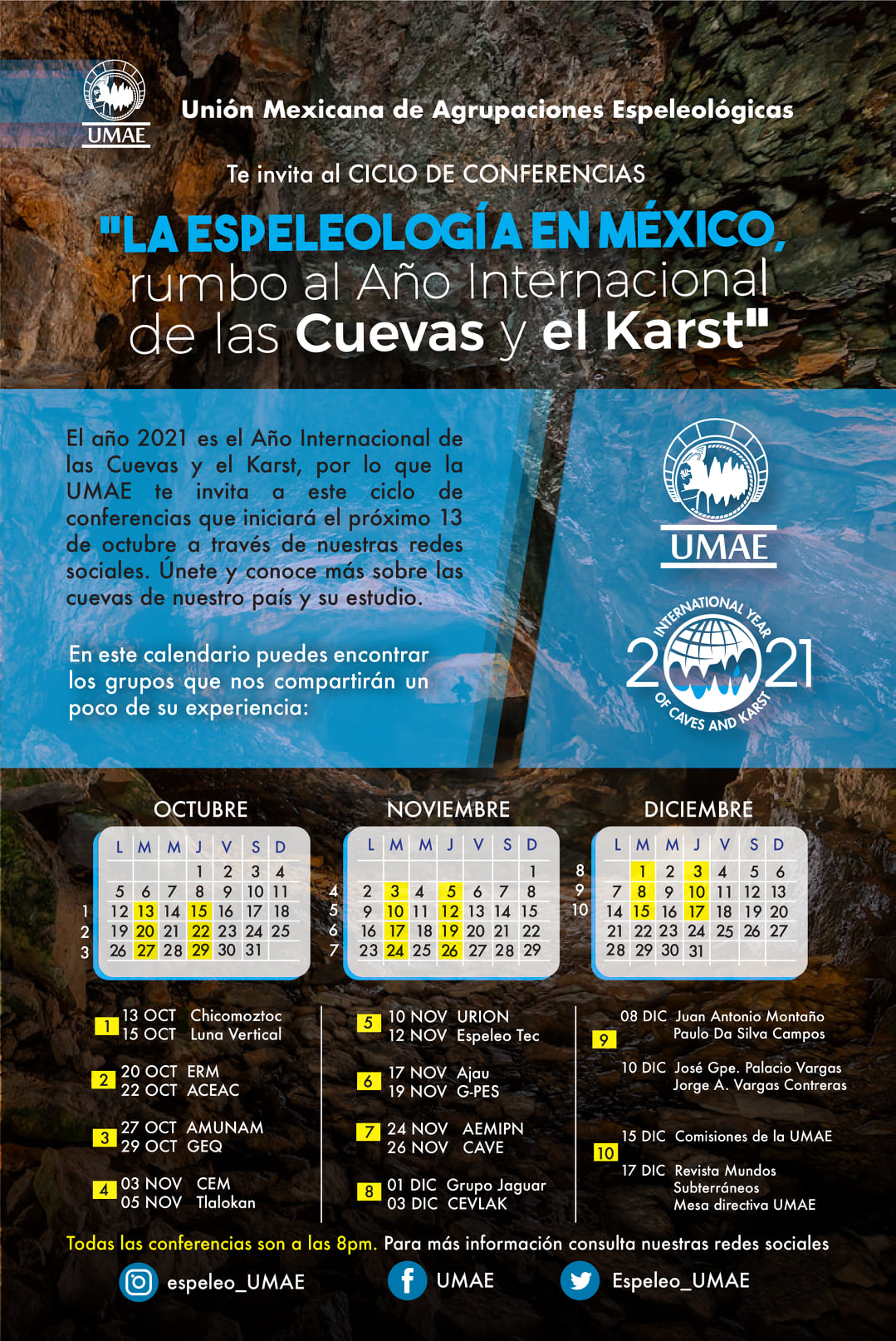 You are cordially invited to the Unión Mexicana de Agrupaciones Espeleológicas’ (UMAE) lecture series dedicated to "Speleology in Mexico", as part of UMAE’s activities toward the "International Year of Caves and Karst".