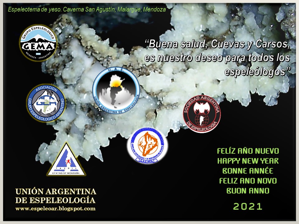 We wish you an excellent year 2021. With health and caves for all.Felíz año nuevoHappy new yearFrom Argentinean Union of Speleology.National federation representative in the UISUNION ARGENTINA DE ESPELEOLOGIA - UAEFederación Personería Jurídica Resolución I.G.J. N° 000669/13Sede legal: Corrientes 5647, 2° of. F, Buenos Aires, Argentina.E-mail: , Web: www.espeleoar.blogspot.comMiembro Delegado de Argentina en la Unión Internacional de Espeleología (UIS)