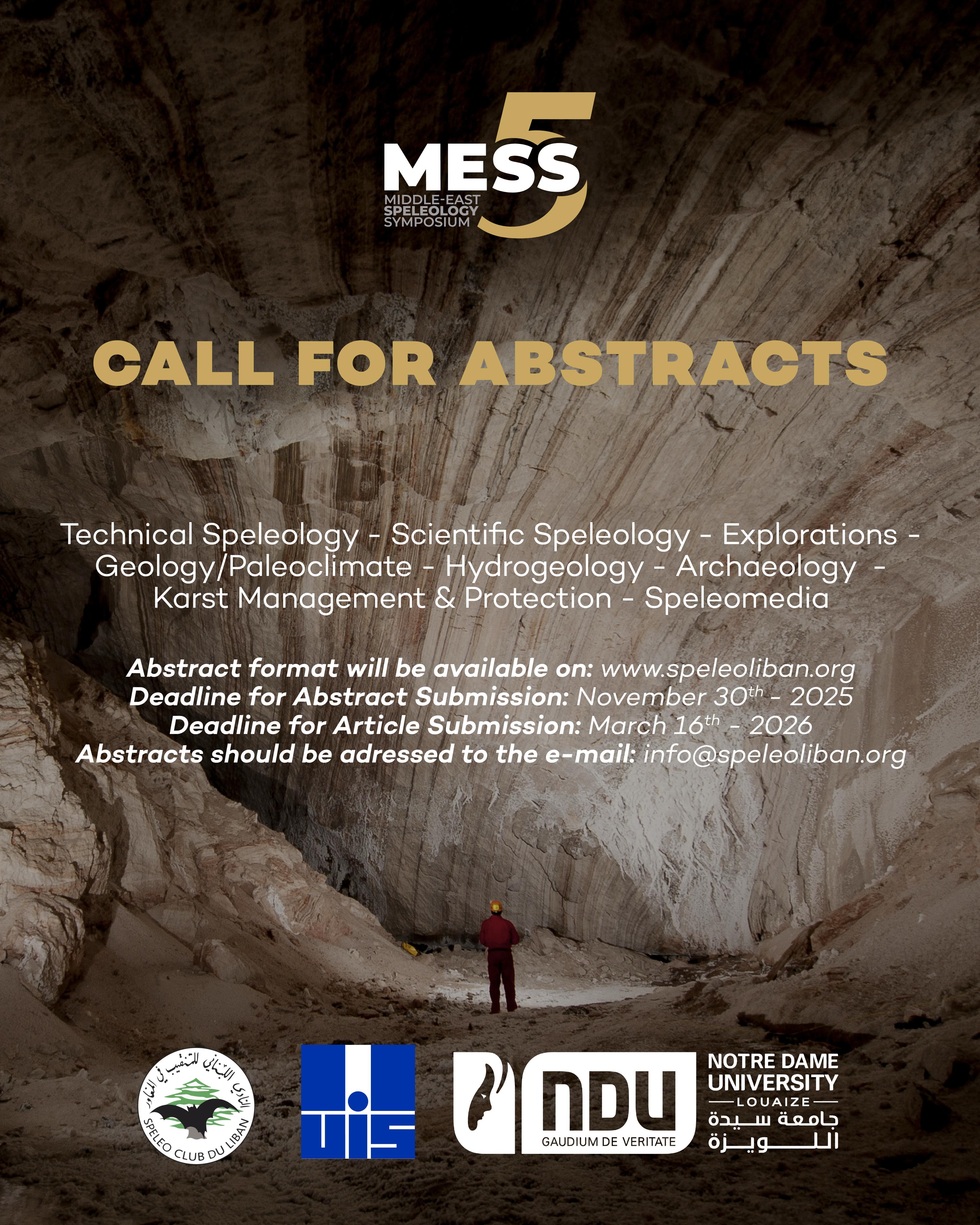 >>>>>>>>>>>We are delighted to invite you to the 5th Middle East Speleology Symposium (MESS5) , which will be held at the Notre Dame University (NDU) – Louaize in Lebanon on April 15, 16, 17 2026 .